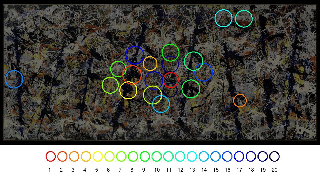 Gaze hotspots of decreasing preference (order indicated by colour scale) and half-width size (diameter of circles), superimposed on ‘Blue Poles’ painting.
