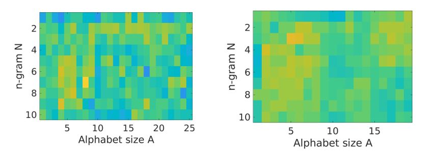 We implemented a standard technique for mapping strings to a vector space (‘bag-of-words model’). Number of letters (alphabet size A) correspond to ROIs, and letter sub-sequences to sparsely occurring events whose frequency is possible to count (n-gram of size N). In this model, a Markov chain is represented with N = 2, and is tested against many other combinations of A and N. Scan path are converted into their string representation, using a variety of algorithms to automatically determine amount of gaze assigned to probability bins (ROIs), which are then transcribed into letters as a function of A. We tested several automatic binning approaches, using (normalised) pixel coordinates of images to define borders of ROIs: distributing gaze data into equally sized bins (grid approach), or into probability chunks having equal amount of gaze assigned (percentile approach) or considering saccadic event amplitude.